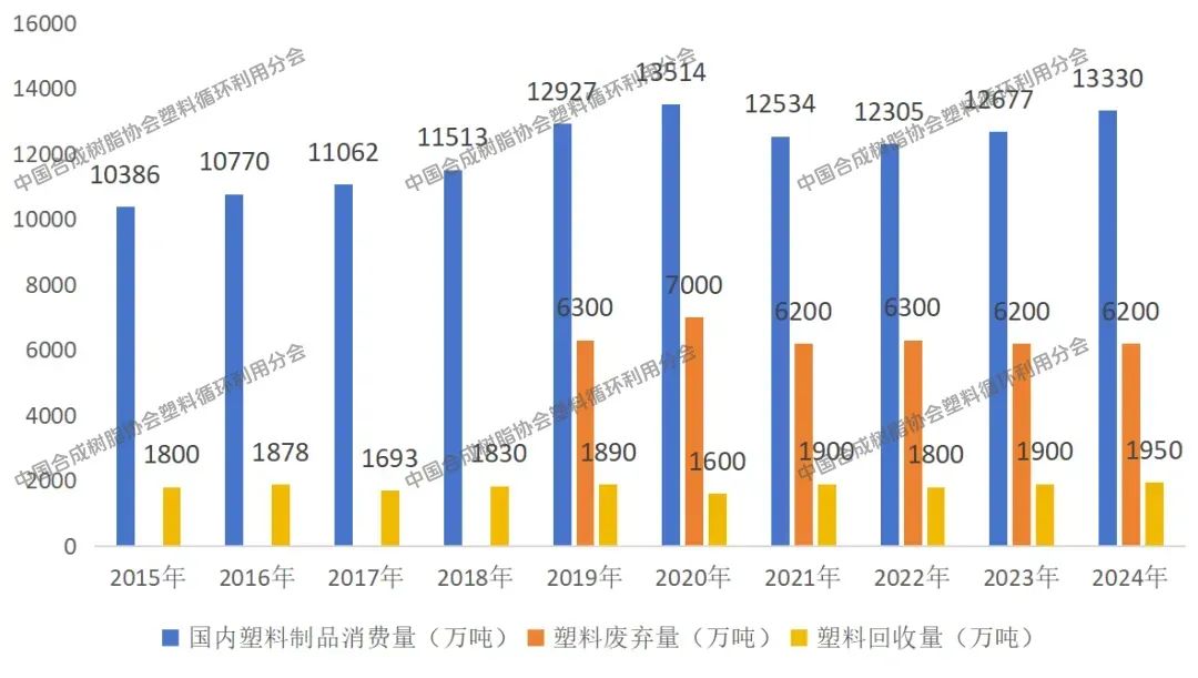 “十年不变”的回收量:公开发布数据显示,近十年来(参考2008-2023年广泛引用的数据)统计的数据,中国废塑料年回收量始终在1900万吨上下小幅波动。