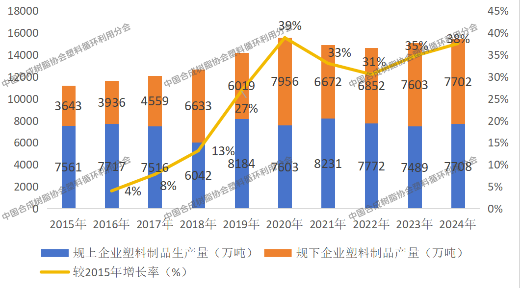 国家统计局数据主要反映规模以上(规上)企业情况(约2万家),其塑料制品产量近十年基本在7500万吨左右波动。然而,全国还有约15万家规模以下(规下)塑料生产企业未被纳入官方统计。