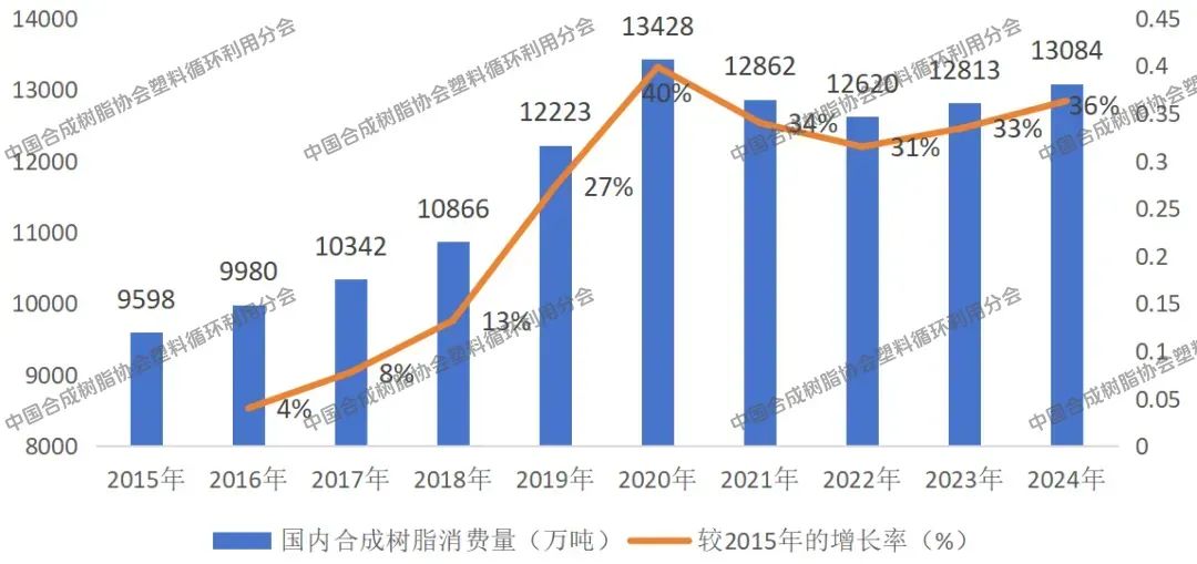 自2015年起,中国合成树脂消费量保持强劲增长,2020年达到了1.34亿吨的峰值,此后国内合成树脂消费量一直处于高位运行状态。2015-2024年间,尽管各年增速有所波动,但整体保持较高水平,至2024年合成树脂消费量较2015年增长高达36%。