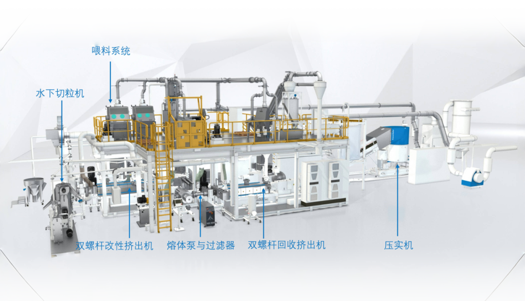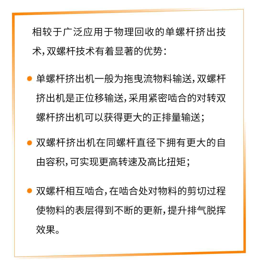 克劳斯玛菲公司双阶在线物理回收改性技术,相比于单阶方案显著提升了生产效率和产品质量。这项技术被赋予了一个富有诗意的名称——“雪绒花”,象征着其在塑料回收领域的纯净与高效。通过这种技术,能够实现一步法将各类回收塑料熔融脱挥过滤后直接在线改性造粒, 产出的高质量的产品可以直接应用于挤出或注塑成型加工,凭借克劳斯玛菲在小分子低聚物脱挥和共混改性的先进技术,以及上下游的整线能力,为客户提供高集成度、低能耗、稳定高产的系统性解决方案。