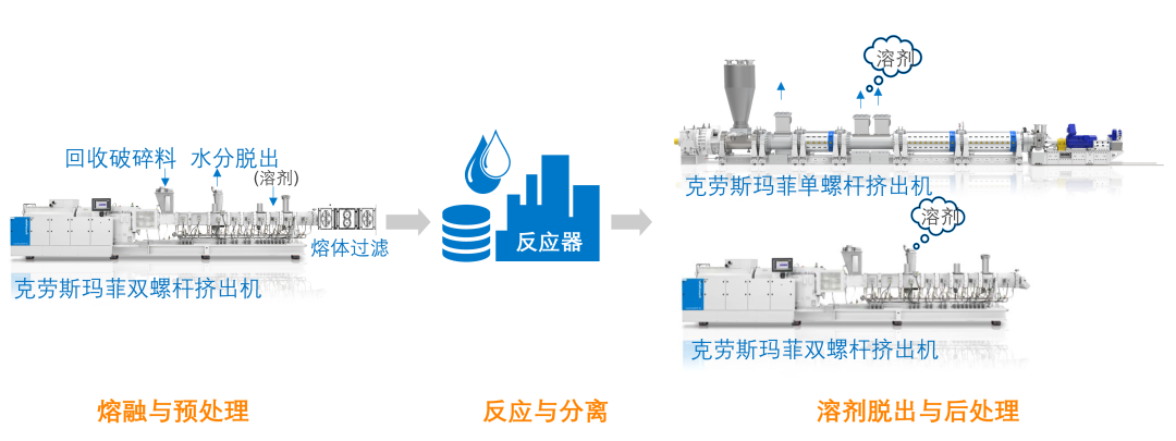 溶剂法在溶解过程利用溶剂来分离聚合物废料。溶剂可以选择性地溶解目标聚合物,这一过程有效地将它们从污染物和其他非目标物质中分离出来。随后,溶液将被净化,溶剂被去除,留下几乎纯净的塑料。克劳斯玛菲挤出设备在这种回收应用中,第一阶双螺杆挤出机将清洗破碎后物料熔融并预脱挥,之后熔体经过过滤后进入反应釜后与溶剂进行反应,再进入大型单螺杆挤出机或者双螺杆挤出机进行二次脱挥并再造粒。