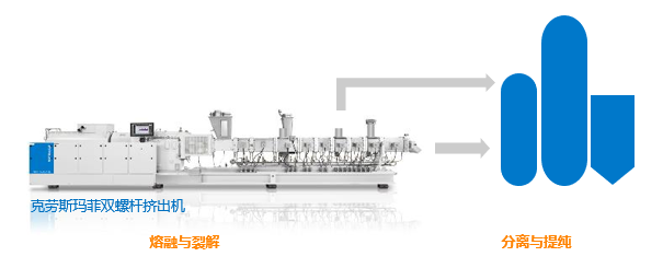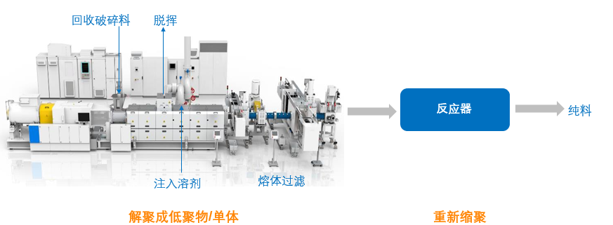 解聚法是一种将缩聚类塑料如如PET、PA、PC、PU在特定溶剂如乙酸存在下,通过糖酵解、水解或氨解等手段溶剂解聚断链生成低聚物或单体,实现溶剂作用下缩聚反应向低聚物的逆转。克劳斯玛菲挤出技术可以保证进入反应器前熔体的高均匀性、高脱挥效率、高产量以及优秀的过滤效果。克劳斯玛菲已为全球知名的PET生产厂家提供多套设备。