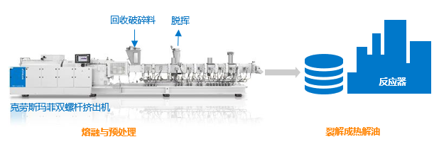 热解法是一种将废塑料在无氧或低氧环境下加热至高温,使其分解成较小分子的化合物如油、可燃气体和固体炭黑的过程,目标产品通常是热解油(C4-C10)。例外情况如PMMA和PS,以气态单体作为热解产物。克劳斯玛菲双螺杆挤出机可以用于预处理与直接裂解, 满足最高达500°C的工作温度, 高温升、高能量输入、高转速等严苛的工艺要求。