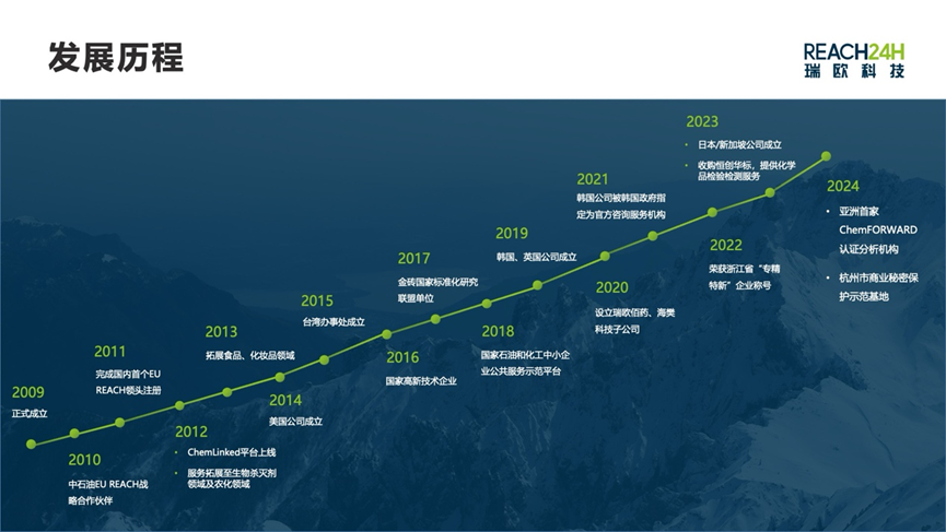 杭州瑞欧科技有限公司创立于2009 年,总部位于中国杭州,在爱尔兰、英国、美国、韩国、日本、新加坡、中国台湾均设立了分支机构,布局全球24 小时咨询服务网络。服务领域覆盖工业化学品、农用化学品、消杀产品、化妆品、食品、包装材料、医药等多个行业,提供产品合规咨询及技术服务、垂直媒体平台及综合性商业服务、化学品检验检测、安全咨询和数字化解决方案等服务。