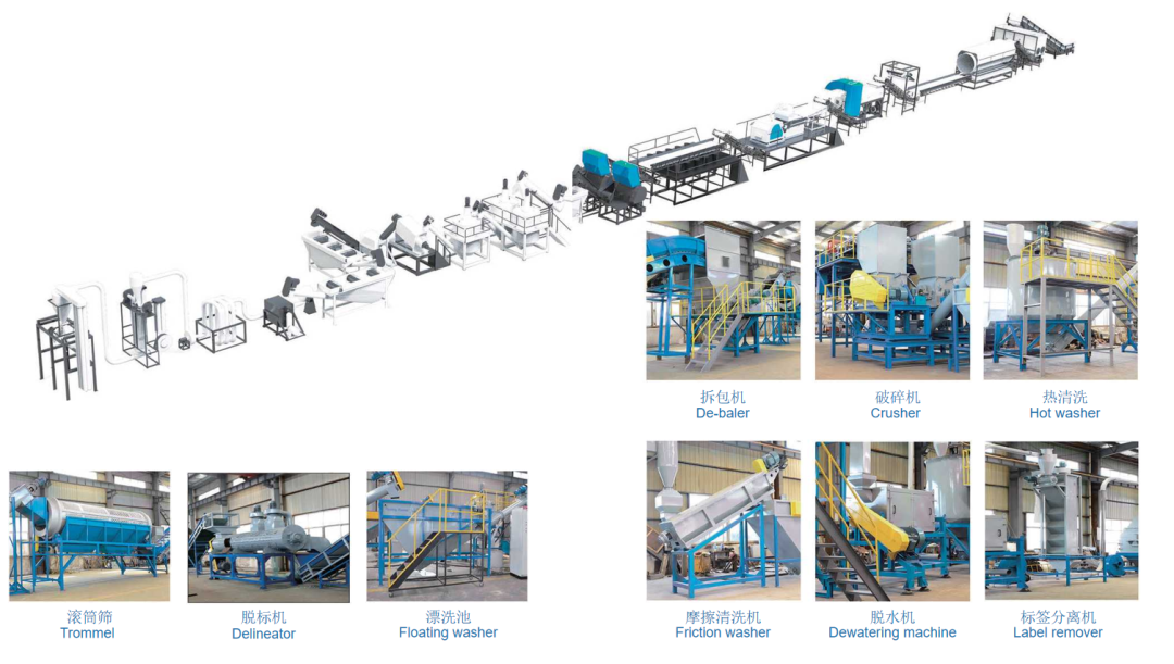 皮带上料机-高速粉碎机-低速脱水机-洗料机-低速脱水机-8米漂洗槽-低速脱水机-8米漂洗槽-低速脱水机标签分离机-储料仓