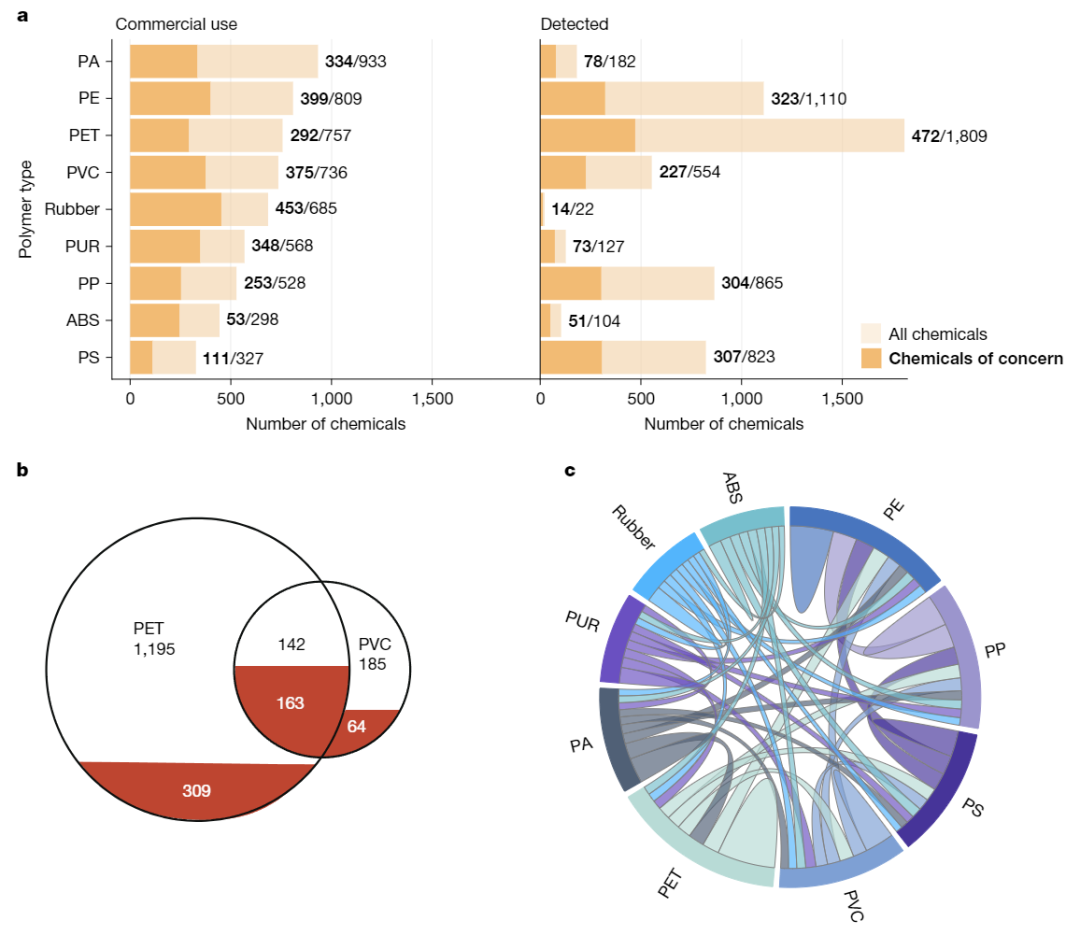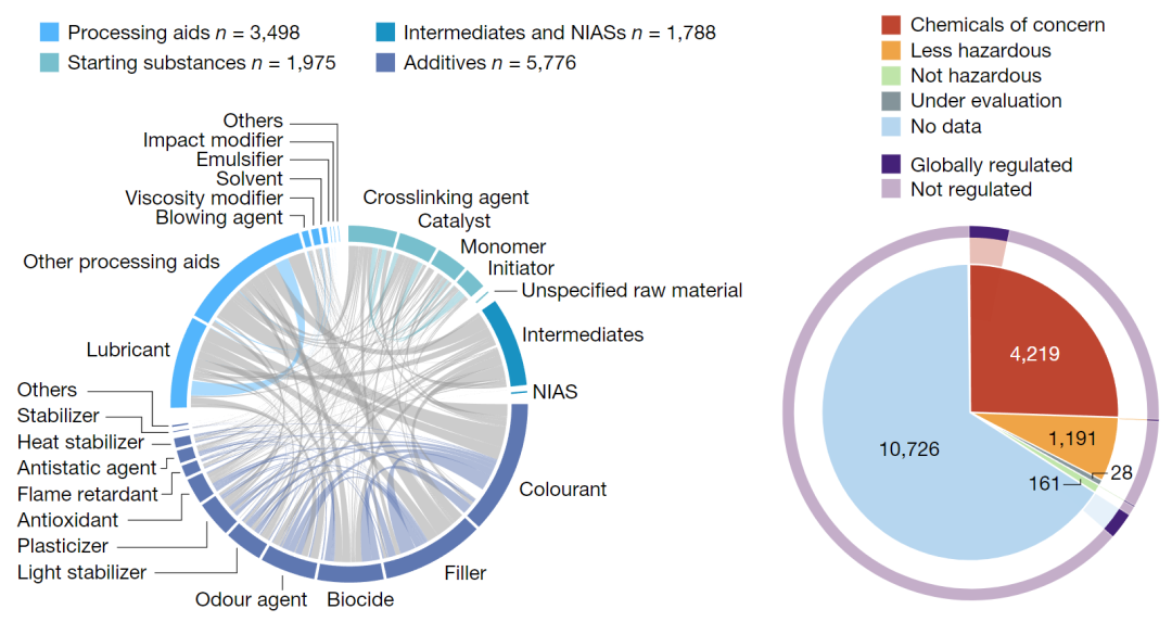 除了塑料物理污染带来的生态危害,塑料中所含或合成中引入的化学添加剂也同样构成严重风险。由挪威科技大学劳拉·蒙克卢斯(L. Monclús)领导的研究团队在另一篇Nature分析中,系统梳理了当前塑料工业使用的化学物质清单。他们识别出16,000余种与塑料生产及制品相关的化学成分,其中约4,200种被归类为“令人担忧的化学品”(chemicals of concern)——即具备毒性、环境持久性或生物蓄积性等特征【见《Mapping the chemical complexity of plastics》,Nature,2025】。