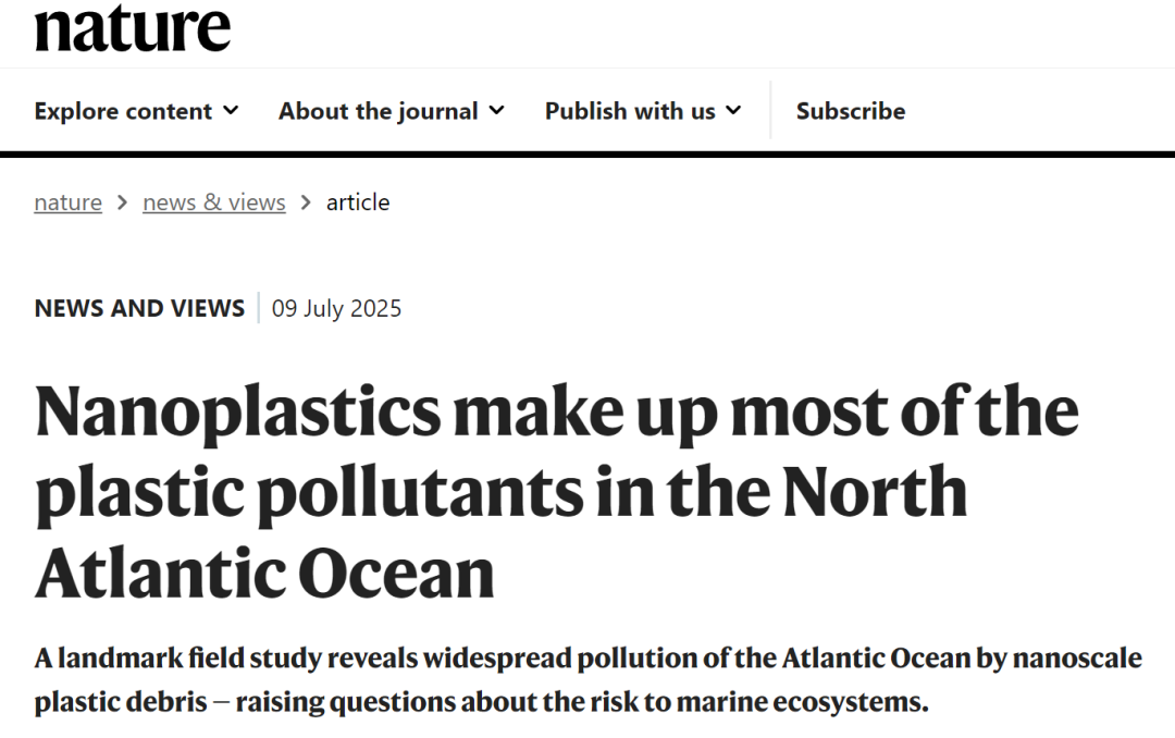 配套的新闻评论文章更进一步指出:这些纳米塑料数量之庞大意味着,它们极可能是目前北大西洋塑料污染的主要构成,远超目视可见的塑料碎片和微塑料。这些粒子可能被浮游生物摄入并进入食物链,最终影响人类健康与海洋生态【见《Nanoplastics make up most of the plastic pollutants in the North Atlantic Ocean》,Nature News & Views,2025】。