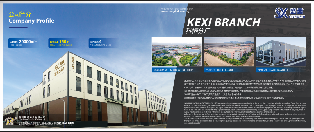 嘉龙锋钢刀具有限公司是中国大陆专业生产机械刀片的规模企业之一,共有4个生产基地(嘉龙平桥总厂、马鞍山盛鑫刀具有限公司(嘉龙二分厂)、九博分厂、大和分厂、科栖分厂),占地20000多平方米,在职员工150余人。2013年设立一分厂,二分厂,实现产量提升,以满足日益增长的需求。