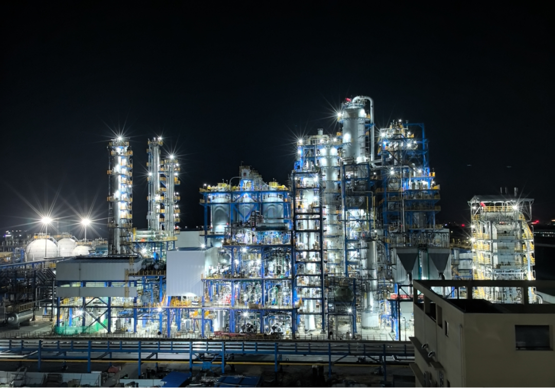 裂解单元一角,图为废塑料裂解气体产品分离塔,稳定产出液化塑料裂解气和塑料裂解轻油。