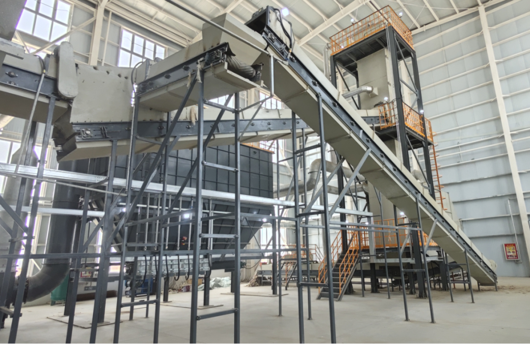 膜渣分离系统,主要对筛分去除土等无机物,开发立式膜渣分离专用设备,利用地膜、秸秆、棉花等不同的尺寸、重量等差异,通过风力和重力实现地膜和秸秆棉花的分离。