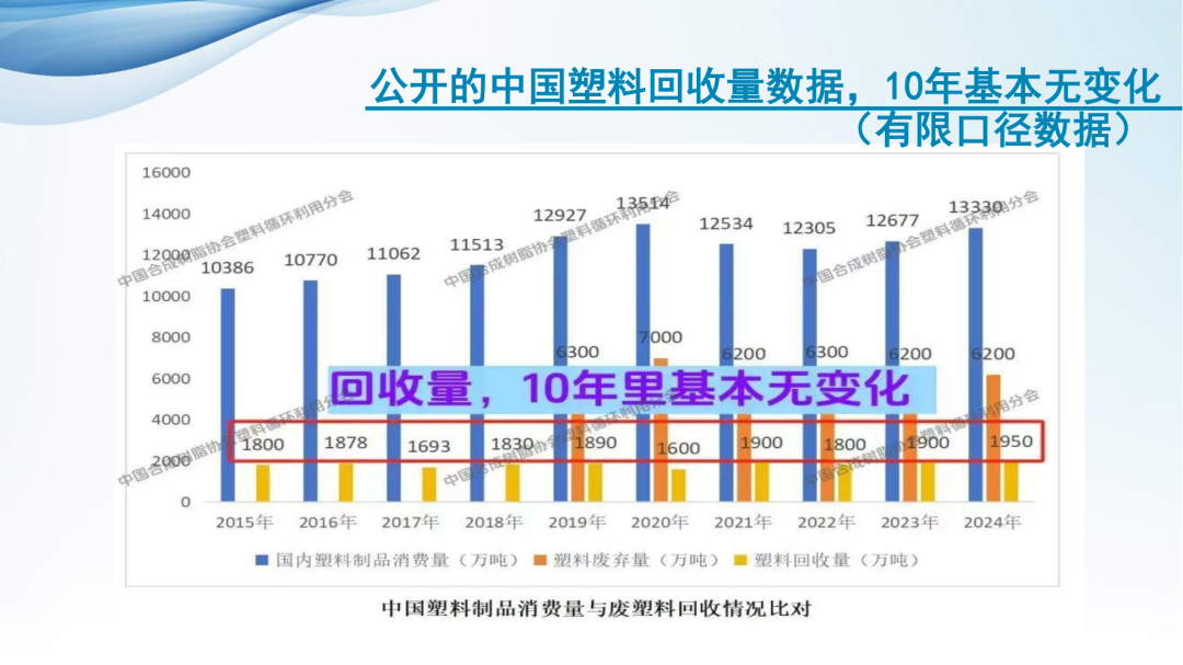 他表示,公开的2024 年中国废塑料产生量达 6200 万吨,回收利用1950万吨,实际上这个数字明显被低估了,经中国合成树脂协会塑料循环利用分会核算,实际的废弃量和回收量有重大的不同。