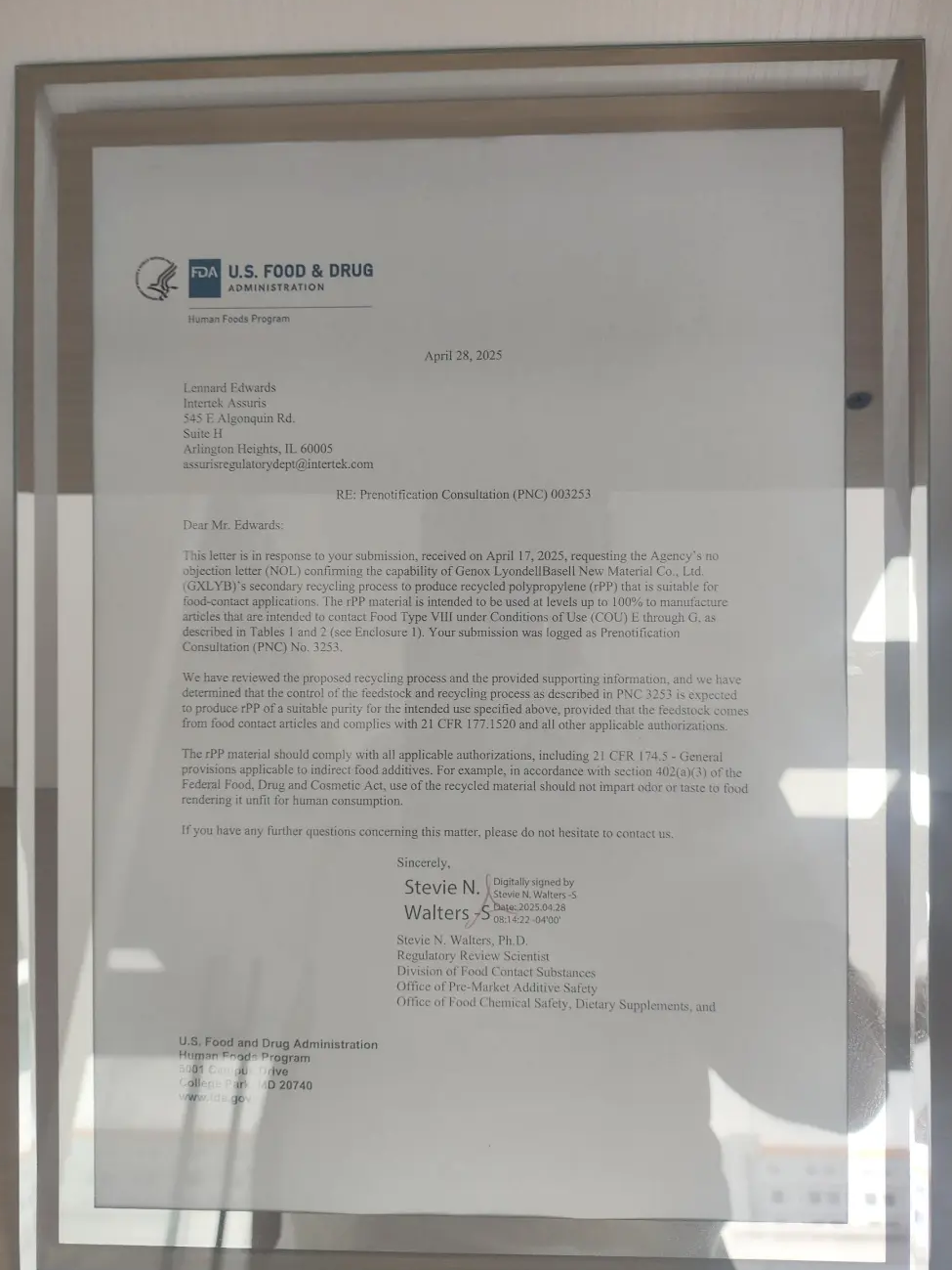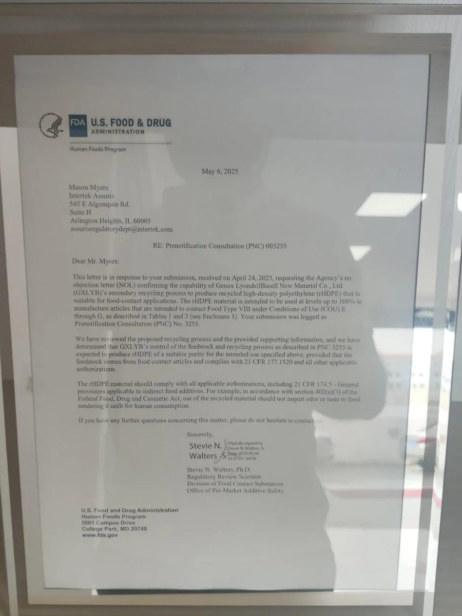 隽诺环保3T食品级HDPE清洗线获得美国FDA签发的无异议函,确认了隽诺环保的清洗系统对消费后高密度聚乙烯(rHDPE)的物理回收能力,回收后的材料可用于接触干性食品,使用条件为E-G[室温灌装及储存、冷冻或冷藏储存(不在容器内加热处理)]。