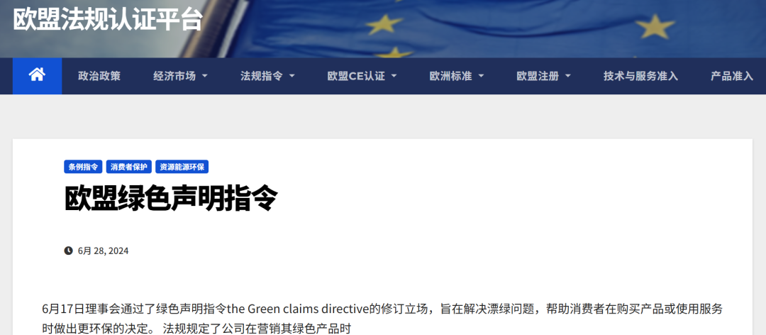 《绿色声明指令》是欧盟旨在规范环保营销宣传的重要补充法规。该指令原本计划作为《赋能消费者指令》的执行补强,却在2024年因欧洲人民党等中右翼政党施压而被迫搁置或重审。