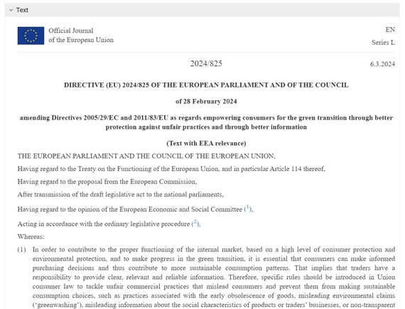 欧盟于2024年3月26日正式生效的《赋能消费者实现绿色转型指令》,是目前绿色消费立法体系的“基本法”之一。该指令旨在加强消费者知情权,打击“洗绿”行为(Greenwashing),并保障消费者能基于真实信息做出可持续的消费决策。