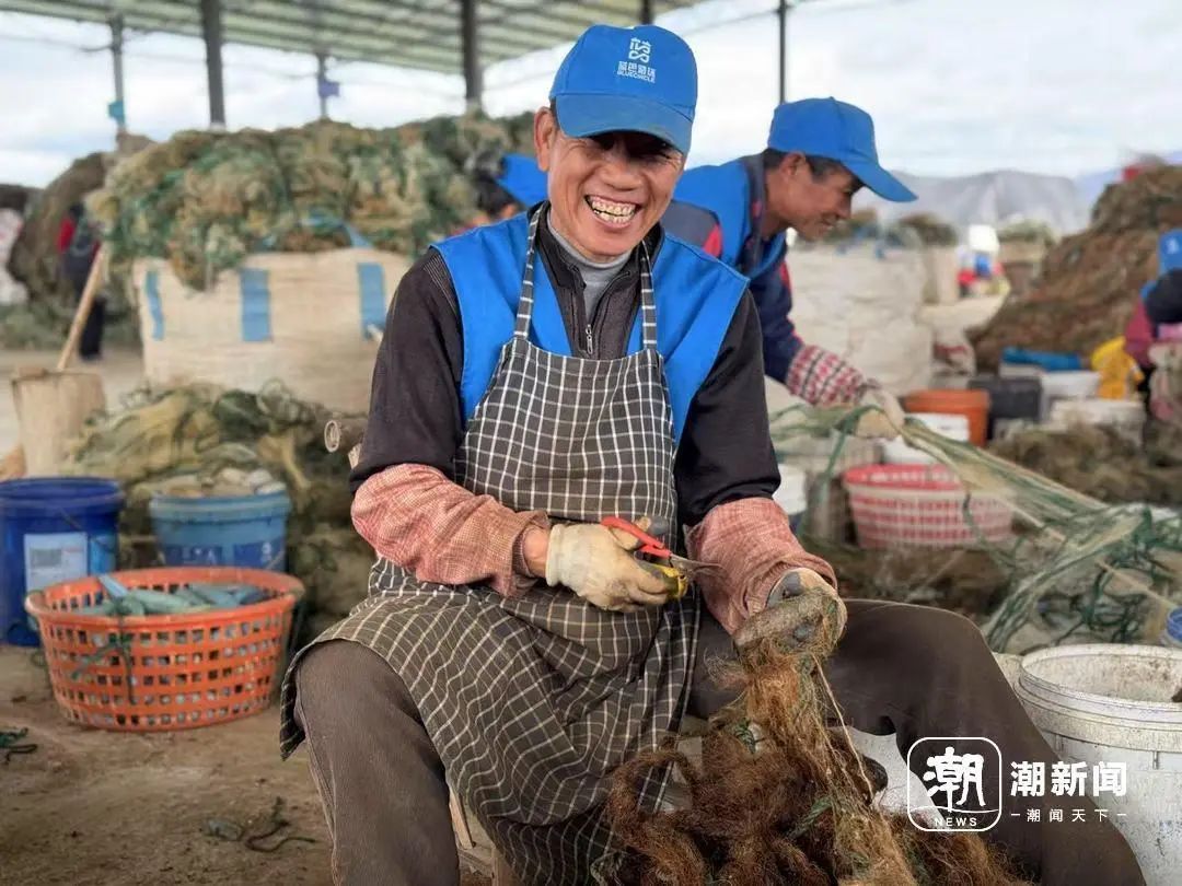台州蓝色循环渔网加工点,村民在清理废弃渔网。记者 陈久忍 摄