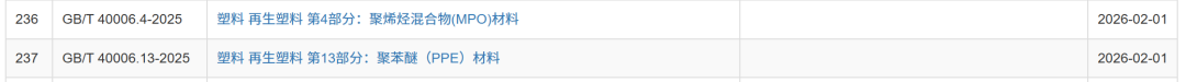 根据国家市场监督管理总局(国家标准化管理委员会)2025年第19号公告,本批共有9项国家标准发布,分别为:《塑料 可回收再生设计指南 第1部分:聚对苯二甲酸乙二醇酯(PET)材料》(GB/T 46020.1-2025)主要起草单位:广西梧州国龙再生资源发展有限公司 、福建赛隆科技有限公司 、艾利丹尼森(中国)有限公司 、福州城投新基建集团有限公司 、好来化工(中山)有限公司 、江苏赛维尔新材料科技有限公司 、成都环投循环科技有限公司 、太原工业学院 、中蓝晨光成都检测技术有限公司 、华南理工大学 、联合利华(中国)有限公司 、河北聚循再生资源回收有限公司 、农夫山泉股份有限公司 、宁波利时日用品有限公司 、汉高(中国)投资有限公司 、达能(中国)食品饮料有限公司 、芬欧蓝泰标签(中国)有限公司 、欧莱雅(中国)有限公司 、妮维雅(上海)有限公司 、中国石油集团石油化工研究院有限公司 、河北腾宏实业有限公司 、三菱瓦斯化学商贸(上海)有限公司 、福建省灿华环保材料有限公司 、河南中阳环保科技有限公司 、安徽峰值科技有限公司 、深洋宝宝科技发展(北京)有限公司 、深圳市绿环再生资源开发有限公司 、无锡一惟进出口有限公司 、北京华塑晨光科技有限责任公司 、中国合成树脂协会 、同轨科技成都有限公司 、广州海关技术中心 。《塑料 可回收再生设计指南 第2部分:高密度聚乙烯(PE-HD)材料》(GB/T 46020.2-2025)主要起草单位:安徽冠泓塑业有限公司 、安徽富林环保科技有限公司 、艾利丹尼森(中国)有限公司 、福州城投新基建集团有限公司 、爱索尔(广州)包装有限公司 、欧莱雅(中国)有限公司 、河北再美高分子材料有限公司 、广州仕天材料科技有限公司 、江苏赛维尔新材料科技有限公司 、可乐丽国际贸易(上海)有限公司 、杭州三晶工艺塑料有限公司 、太原工业学院 、三樱包装(江苏)有限公司 、联合利华(中国)有限公司 、妮维雅(上海)有限公司 、赫力昂(中国)有限公司 、中蓝晨光成都检测技术有限公司 、沙伯基础(中国)研发有限公司 、河北聚循再生资源回收有限公司 、高露洁棕榄(中国)有限公司 、芬欧蓝泰标签(中国)有限公司 、华南理工大学 、山东文远环保科技股份有限公司 、亚美达环保科技股份有限公司 、东莞市国亨塑胶科技有限公司 、广东泰昊资环科技有限公司 、四川大学 、贵州博裕新能源科技有限公司 、深圳市绿环再生资源开发有限公司 、中国合成树脂协会 、江苏金发资源循环有限公司 、同轨科技成都有限公司 、青岛海关技术中心 、北京华塑晨光科技有限责任公司 、广州海关技术中心 、天津大学 。《塑料 再生塑料 第4部分:聚烯烃混合物(MPO)材料》(GB/T 40006.4—2025)主要起草单位:北京华塑晨光科技有限责任公司 、广州仕天材料科技有限公司 、江苏亨通线缆科技有限公司 、宁波海关技术中心 、广州质量监督检测研究院 、中国石油天然气股份有限公司石油化工研究院 、中石化(北京)化工研究院有限公司 、阜阳市产品质量监督检验所 、山东道恩高分子材料股份有限公司 、苏州润佳高分子材料有限公司 、江西格林循环产业股份有限公司 、中蓝晨光成都检测技术有限公司 、上海化工研究院有限公司 、宁波泰甬汽车零部件有限公司 、广州维港环保科技有限公司 、江苏安拓普聚合物有限公司 、同轨科技成都有限公司 、杭州中旺科技有限公司 、天津大学 、华南理工大学 、慧可启(上海)科技有限公司 、潍坊鹏洲高分子材料有限公司 、广州海关技术中心 、苏州金耳环新材料科技有限公司 、青岛理工大学 、青岛海关技术中心 。《塑料再生塑料第13部分:聚苯醚(PPE)材料》(GB/T 40006.13-2025)主要起草单位:上海聚威新材料股份有限公司 、湖南恒屹新材料有限公司 、上海金发科技发展有限公司 、平顶山学院 、北京华塑晨光科技有限责任公司 、龙口利佳电气有限公司 、杭州本松新材料技术股份有限公司 、宁波海关技术中心 、上海汽车集团股份有限公司 、中蓝晨光成都检测技术有限公司 、同轨科技成都有限公司 、杭州中旺科技有限公司 、慧可启(上海)科技有限公司 。《塑料 再生塑料 可追溯性和环境因素评估指南》(GB/T 46043—2025)