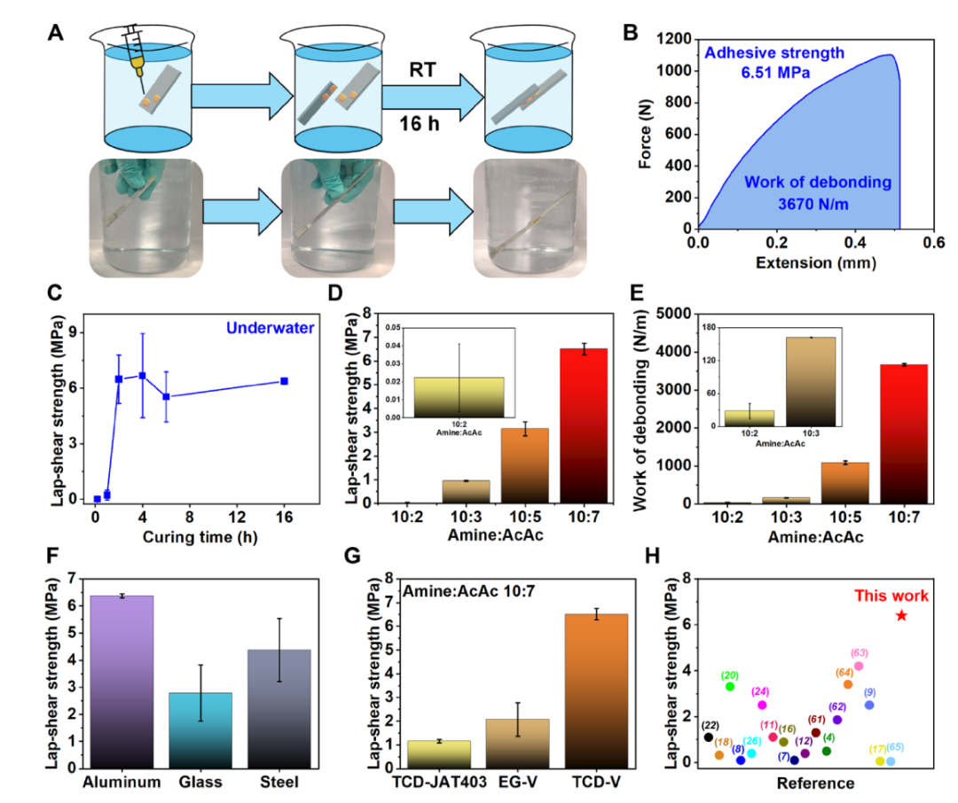 图3 TCD-V的水下粘合性能。(A)将粘合剂施加到基底上,并在水下将它们连接在一起。使组装好的接头在粘合后立即自支撑,在室温下水下固化16小时。(B)力-延伸曲线显示10:7 TCD-V在室温水中固化16小时后的水下粘合性能。(C)10:7 TCD-V的搭接剪切强度。(D)在室温下水下固化后,TCD-100 V的不同胺:AcAc的搭接剪切强度。10:7配方显示出最高的粘合性,搭接剪切强度为6.51MPa。(E)各种胺的剥离功值:(F)TCD-100 V粘合剂的水下粘合的搭接剪切强度。粘合强度与表面的亲水性直接相关,其中亲水性较差的基材显示出较大的搭接剪切强度。7例TCD-用JAT 403替代PET-JAT 403的患者和对照组(TCD-JAT 403)和TCDAcAc被EGAcAc(EG-JAT 403)代替。(H)比较来自文献的水下粘合剂的最近实例与我们的粘合剂的曲线图。