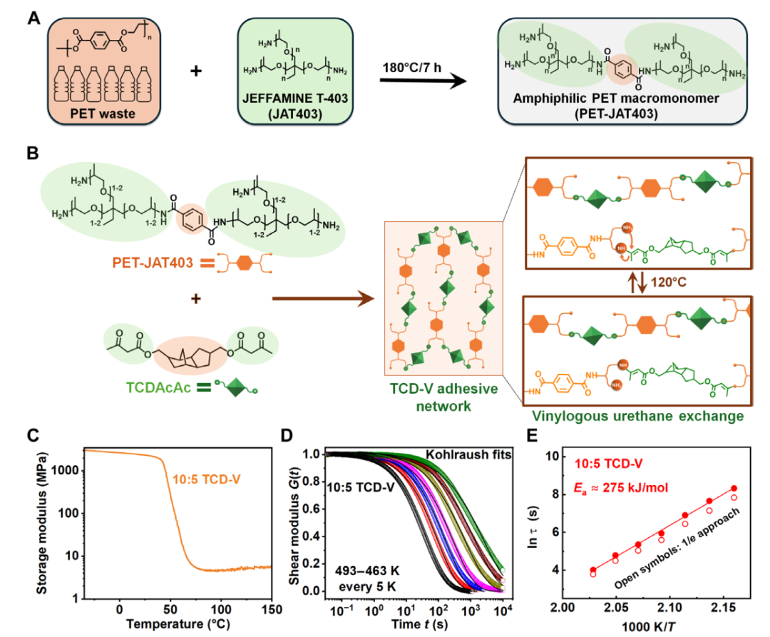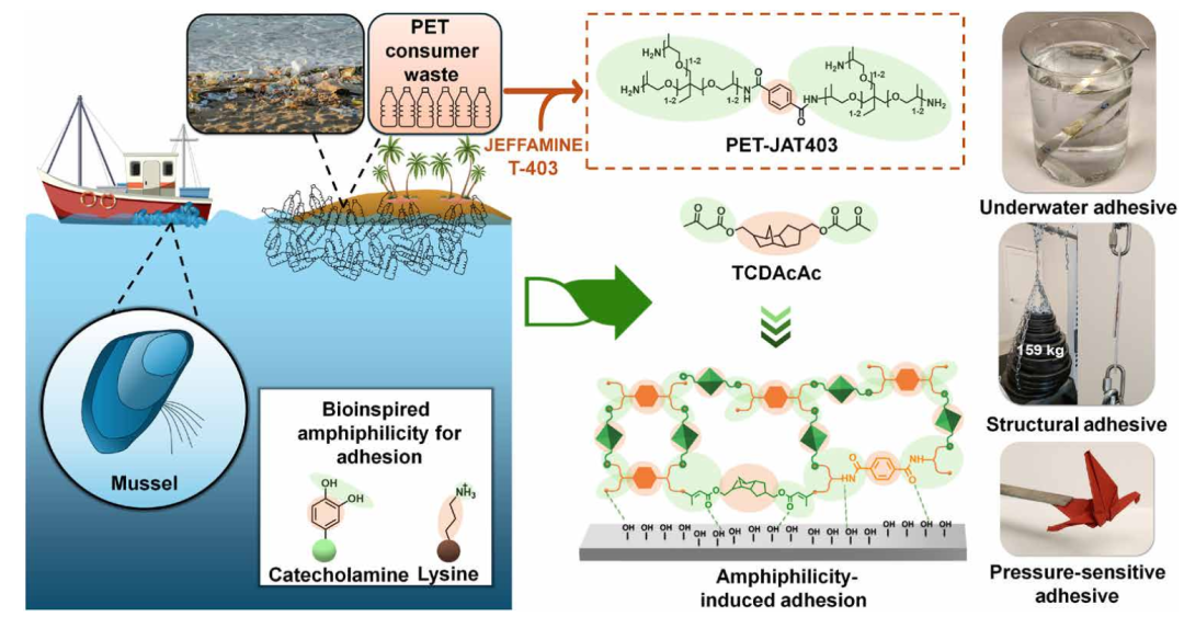在塑料化学循环逐步迈入产业化“第二阶段”的关键时刻,一项令人振奋的技术突破再次刷新了人们对塑料资源化的想象边界——科学家成功将废弃饮料瓶(PET)转化为一种可水下使用、可重复脱粘再利用的“高性能可逆胶粘剂”,其性能全面超越传统结构胶、热熔胶与压敏胶。这一创新不仅解决了粘接材料长期以来“不可修复、不可回收”的痛点,也为废塑料向高值化材料转化开辟了全新路径。该案例充分展现了化学循环的“产品化潜力”与“结构性降碳”能力,是化学回收从“单体/燃料回收”走向“功能材料制造”的里程碑式探索。