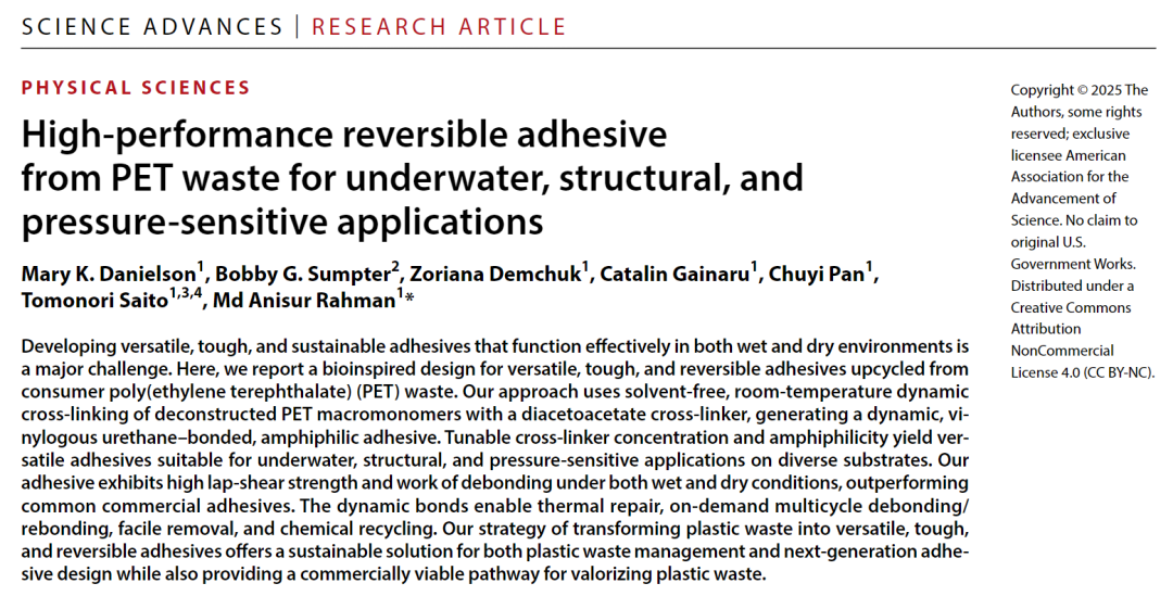 废弃塑料瓶“变身”强力胶,挑战水下和结构粘接极限丨美国橡树岭国家实验室,最新Science Advances