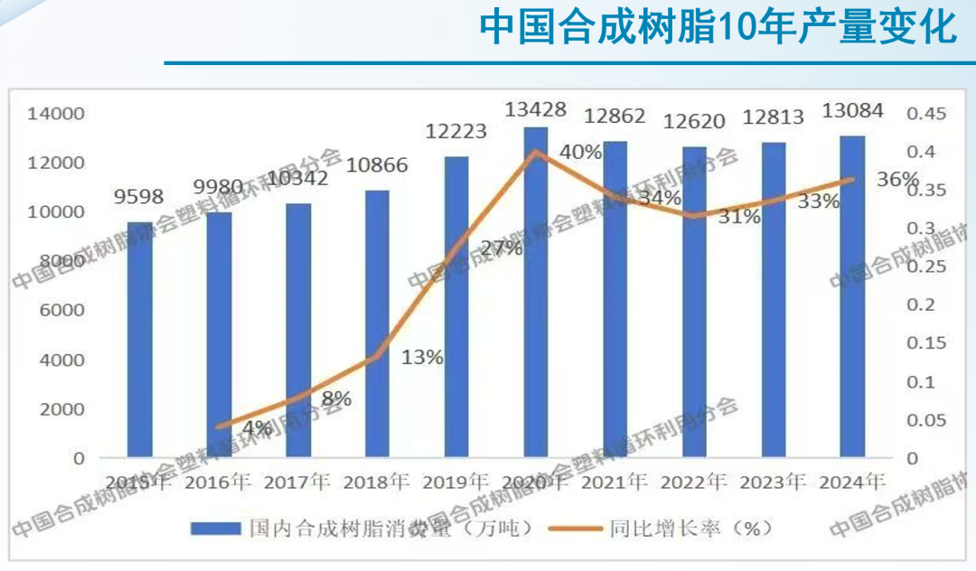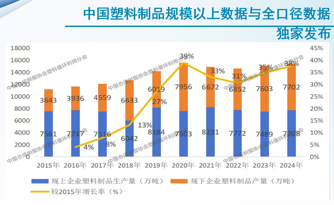 在数据层面,王会长依据CPRRA发布的《2020-2024年中国废塑料循环再生产业全景洞察报告》进行了深入分析。他指出,过去十年间,中国塑料回收量整体保持相对稳定,与此同时,中国合成树脂的产量却呈现出显著的增长趋势。此外,王会长还发布了中国塑料制品规模以上与规模以下企业的生产量(万吨)以及相较于2015年的增长率(%),并且独家披露了2020年至2024年中国塑料回收和再生领域的详细数据,涵盖废弃量、焚烧和填埋量、海洋泄漏量、陆地泄漏量、回收量以及再生量等关键指标。