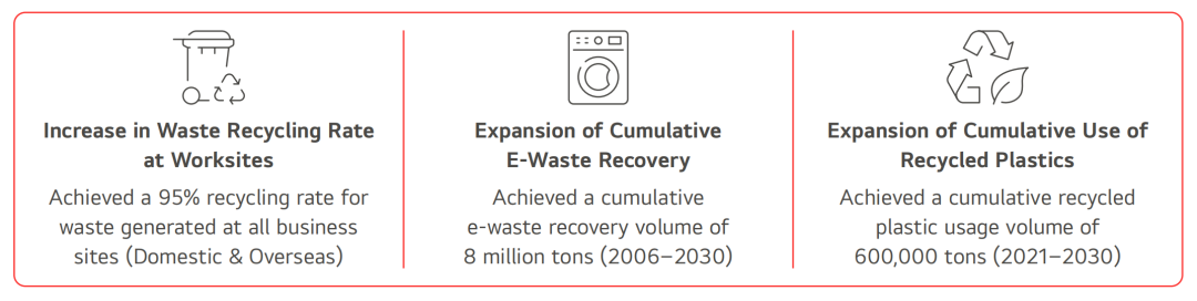 LG 电子将再生塑料作为减少资源消耗和环境影响的核心举措,持续扩大其在产品中的使用比例。自 2021 年以来,累计使用再生塑料已达 18.8 万吨,并设定了到 2030 年累计使用 60 万吨的中长期目标。