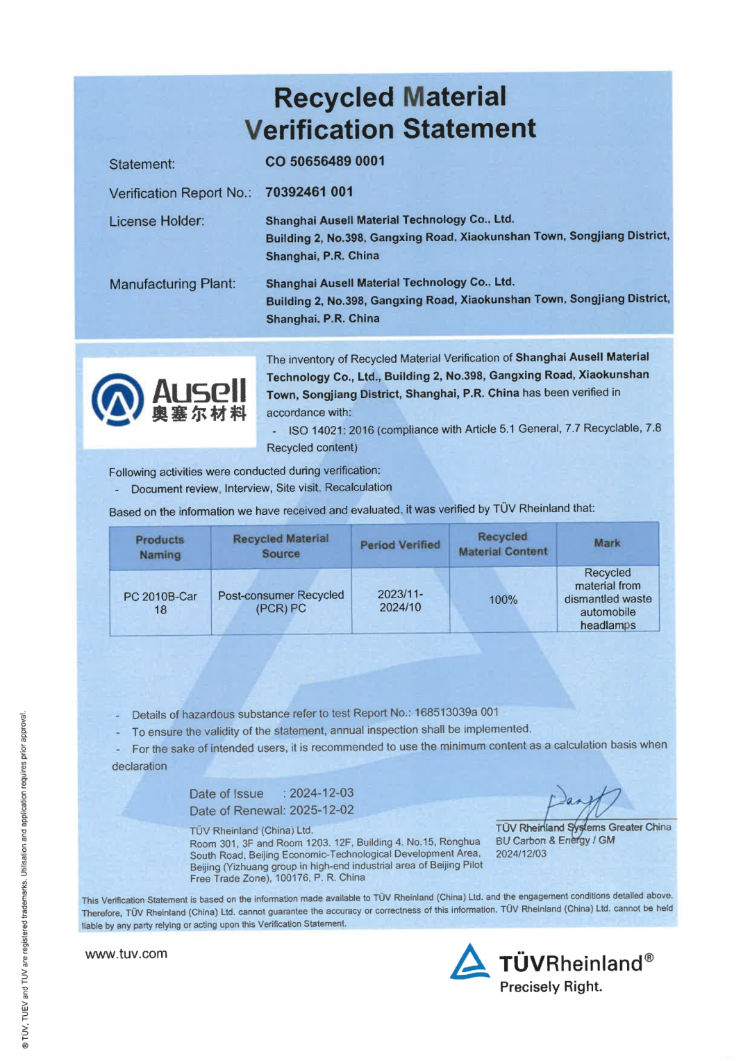 TUV全球首张汽车回收材料消费后再生塑料含量验证证书