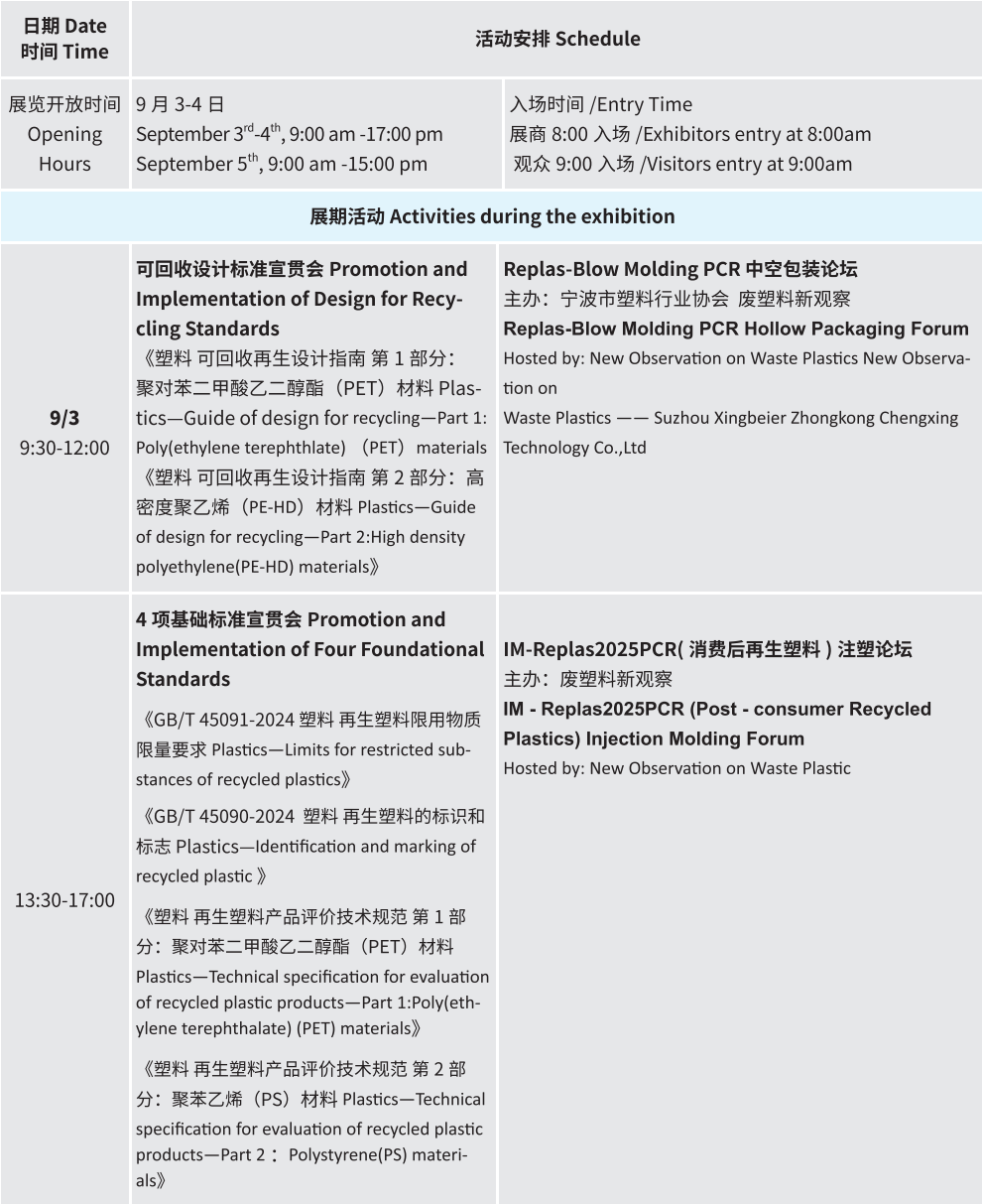 9 月 3 日·聚焦标准与应用:《塑料 可回收再生设计指南》等再生塑料国家标准新闻发布会及宣贯会、Replas-Blow Molding PCR 中空包装论坛、IM-Replas2025 PCR 注塑论坛,政策细节与技术落地同步解析