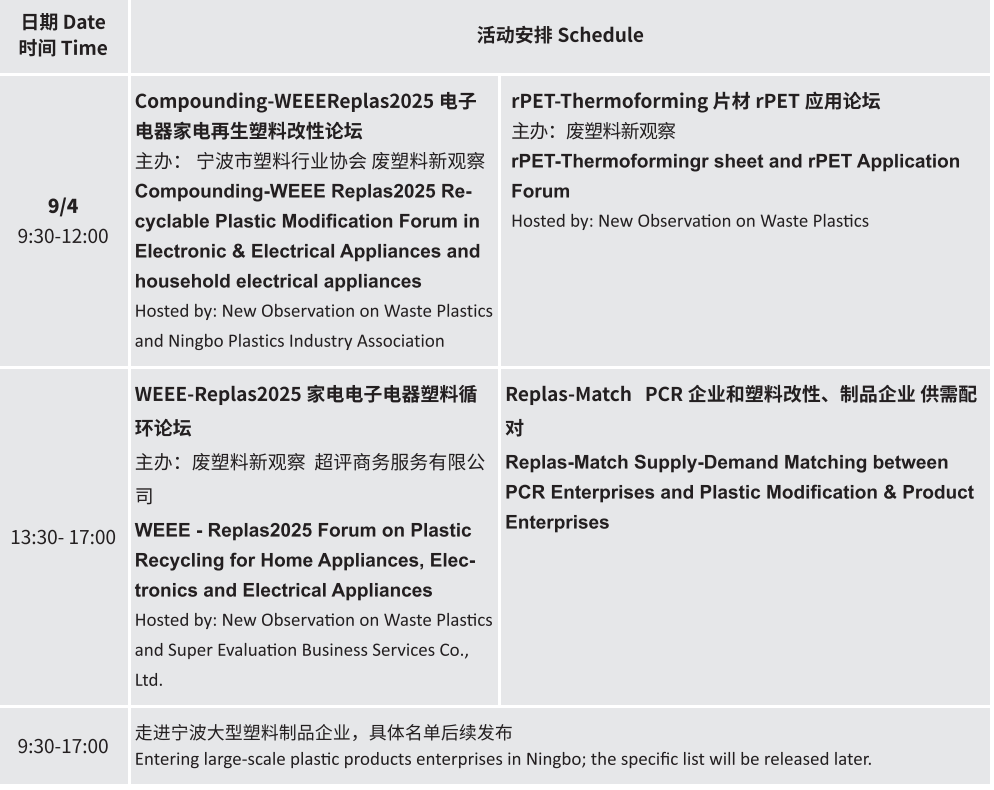 9 月 4 日·深耕细分领域:“电子电器家电再生塑料改性论坛”“rPET 片材应用论坛” 带您解锁材料高值化路径,下午更有 “WEEE-Replas2025 家电电子电器塑料循环论坛” 和 “PCR 企业供需配对会”,精准对接上下游需求;
