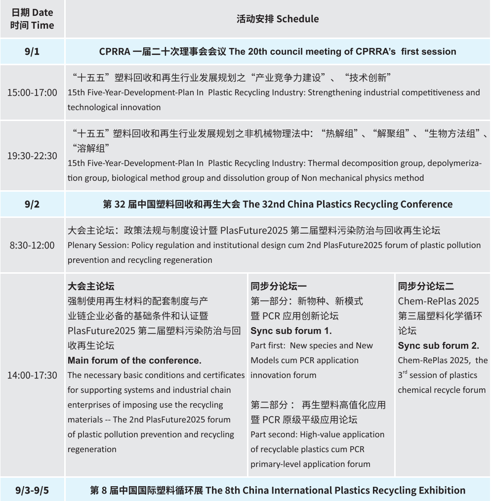 9 月 3 日·聚焦标准与应用:《塑料 可回收再生设计指南》等再生塑料国家标准新闻发布会及宣贯会、Replas-Blow Molding PCR 中空包装论坛、IM-Replas2025 PCR 注塑论坛,政策细节与技术落地同步解析