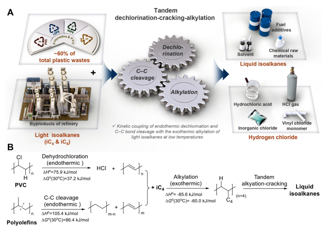 这一“脱氯–裂解–烷基化”协同过程自动发生,“热力学吸热过程相互抵消”,因此反应可以在非常温和的温度下自发前进,为废塑料化学回收开启了新的可能。