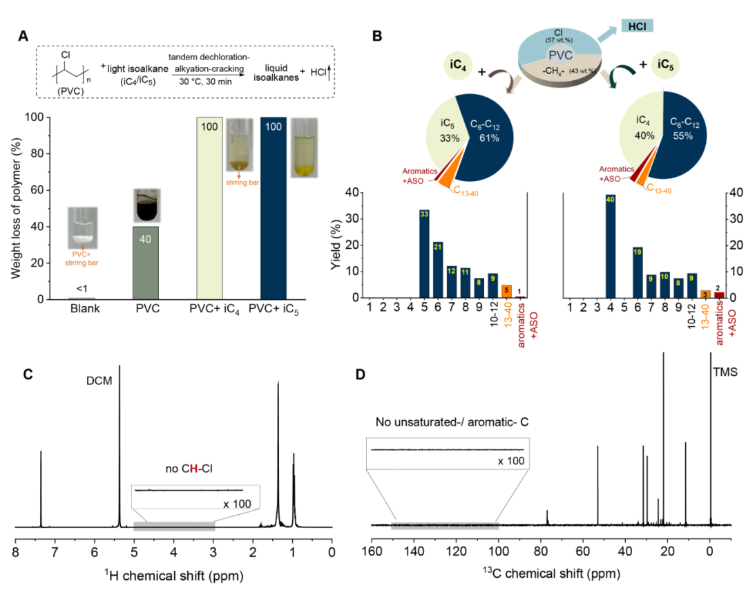 图2. PVC在室温下的串联脱氯-烷基化-裂解。(A)与不含异烷烃的PVC解构相比,PVC/异烷烃在基于AlCl 3的氯铝酸盐离子液体上一锅催化上循环为液体烷烃。反应条件:PVC,200 mg; iC 4/iC 5,800 mg,催化剂,1 mmol,DCM,3 ml;插图显示了在反应和加入萃取剂之后拍摄的快照。(B)来自PVC与iC 4和iC 5反应的产物分布,(C和D)PVC/iC 5反应后上层有机层中产物的1H(C)和13 C NMR(D)谱,证实有机产物是无氯烷烃