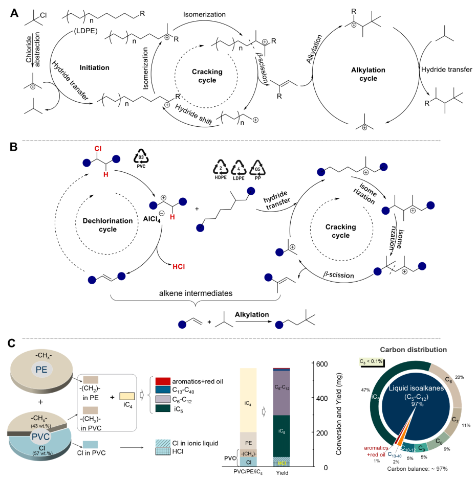 大量聚烯烃与PVC塑料曾被视为化学回收的“禁区”,如今,这一常压、低温、一锅法催化策略为我们展示了塑料垃圾向高价值清洁燃料转化的全新方向——无需高温裂解、无需多步分离、无需高风险脱氯,只需要一个小小的离子液体体系和廉价的异构烷烃。
