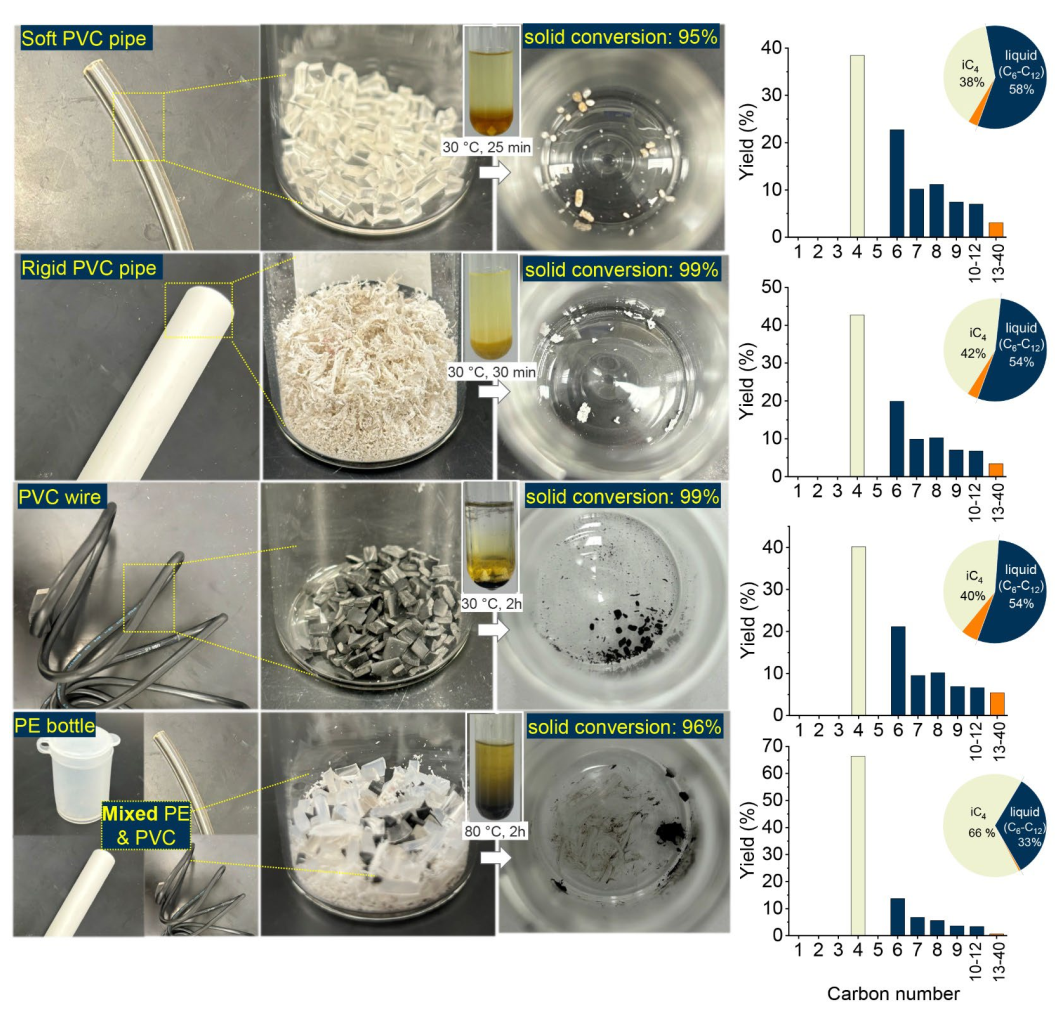 进一步试验表明,利用PVC作为“反应起始剂”,可以显著提升聚乙烯低温降解效率,无需添加工业上常用但有腐蚀性的“叔丁基氯(TBC)”引发剂——这为日后推广到复杂混合塑料提供了重要助力。