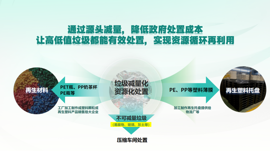 生活垃圾难以实现有效减量化主要在于无法将其低值可回收物部分(废塑料、薄膜等)实现有效分选,混合垃圾资源化价值低、分选技术受限。通过城市生活垃圾减量解决方案,在原有环卫架构垃圾中转站内即可实现低值回收物的减量处置,整线采用机械化自动化分选技术,使低值可回收物实现有效分选回收,实现资源化增值。