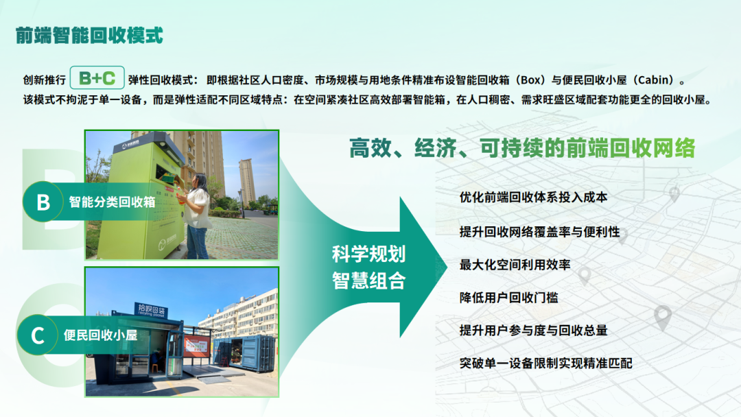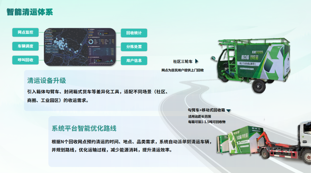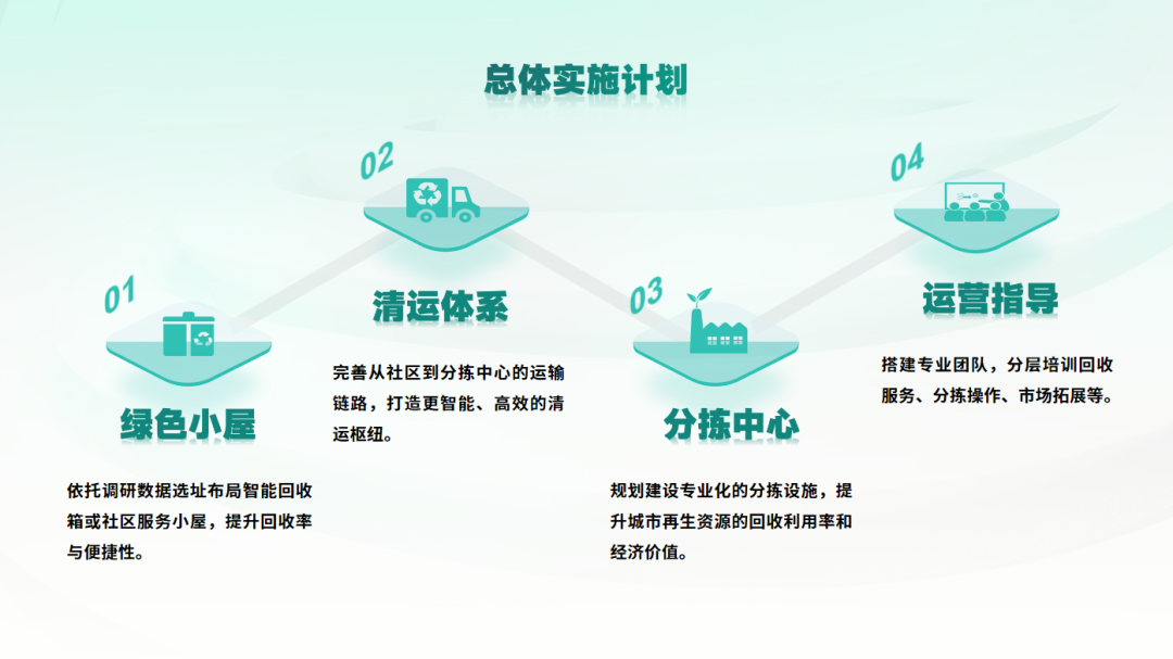 再生资源回收体系建设方案主要为大型环保企业、城市管理部门定制建设,以 “点 - 站 - 厂” 布局,搭建从前端便民小屋 — 中端清运体系 — 后端绿色智能分拣中心的体系模式,构建涵盖收集、运输、分拣、加工、利用的全链条协同机制,运用财税补贴等激发市场主体活力,依托技术创新提升资源化效率,形成“资源—产品—再生资源”的价值闭环,通过多元协同、利益共享循环经济模式,实现环境效益与经济效益双赢。