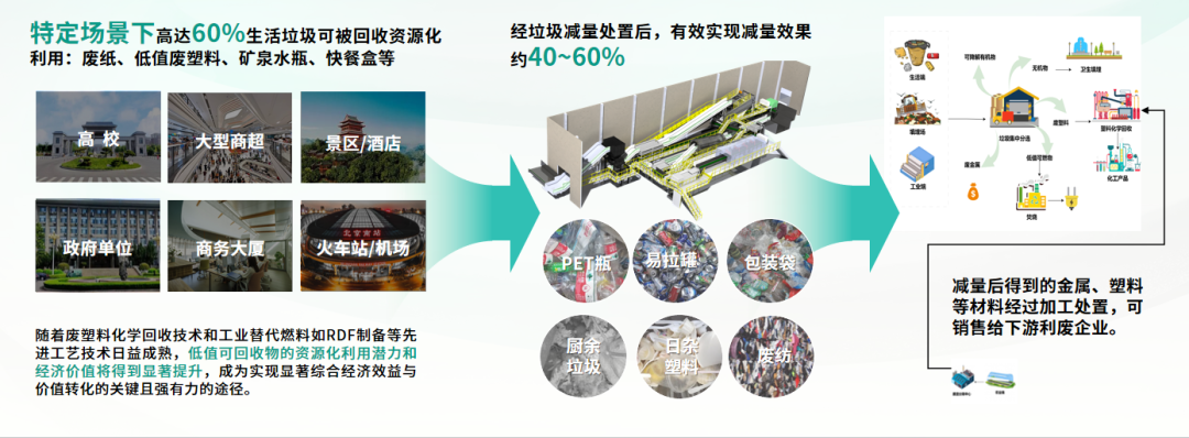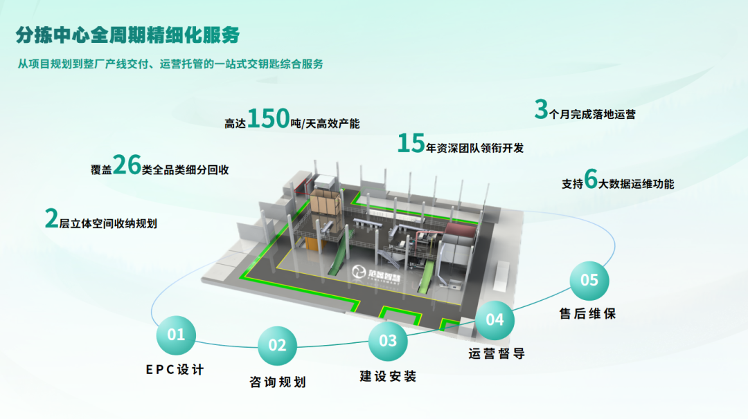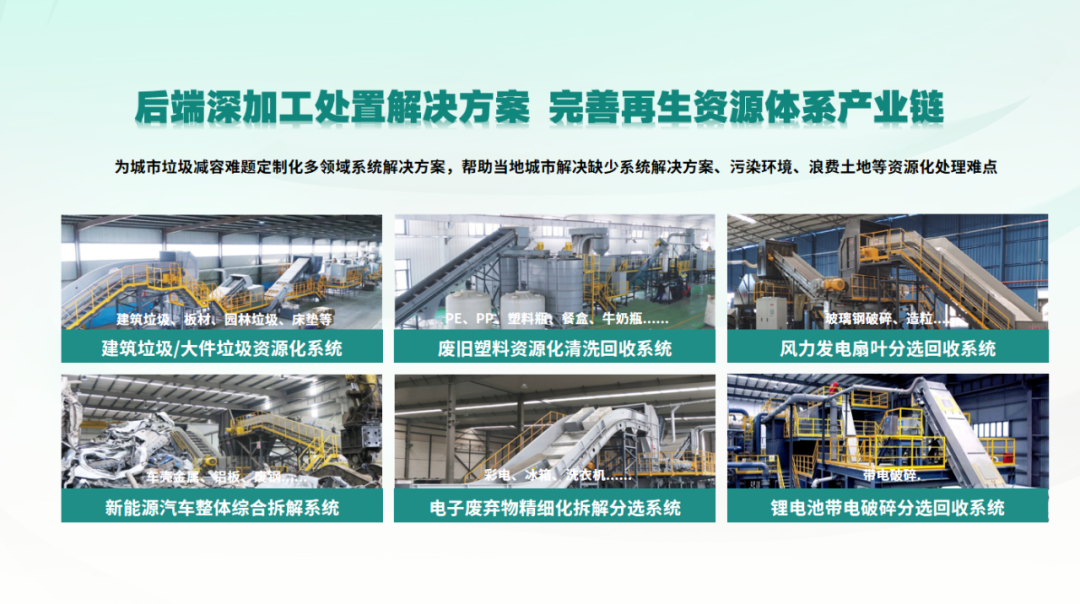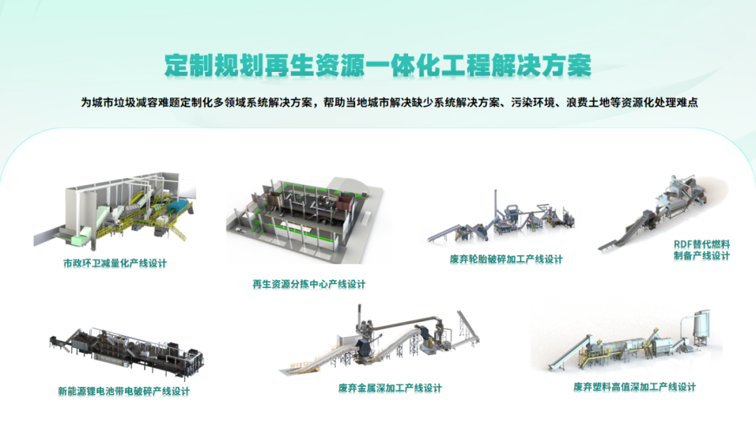 提供定制化多领域系统解决方案(建筑垃圾、废旧塑料、风电叶片、新能源车、电子电器、锂电池等),打造再生资源一体化工程,系统性解决城市垃圾减容、环境污染与土地浪费难题。贯通前后端实现深度闭环,促进资源高效流转与循环经济。