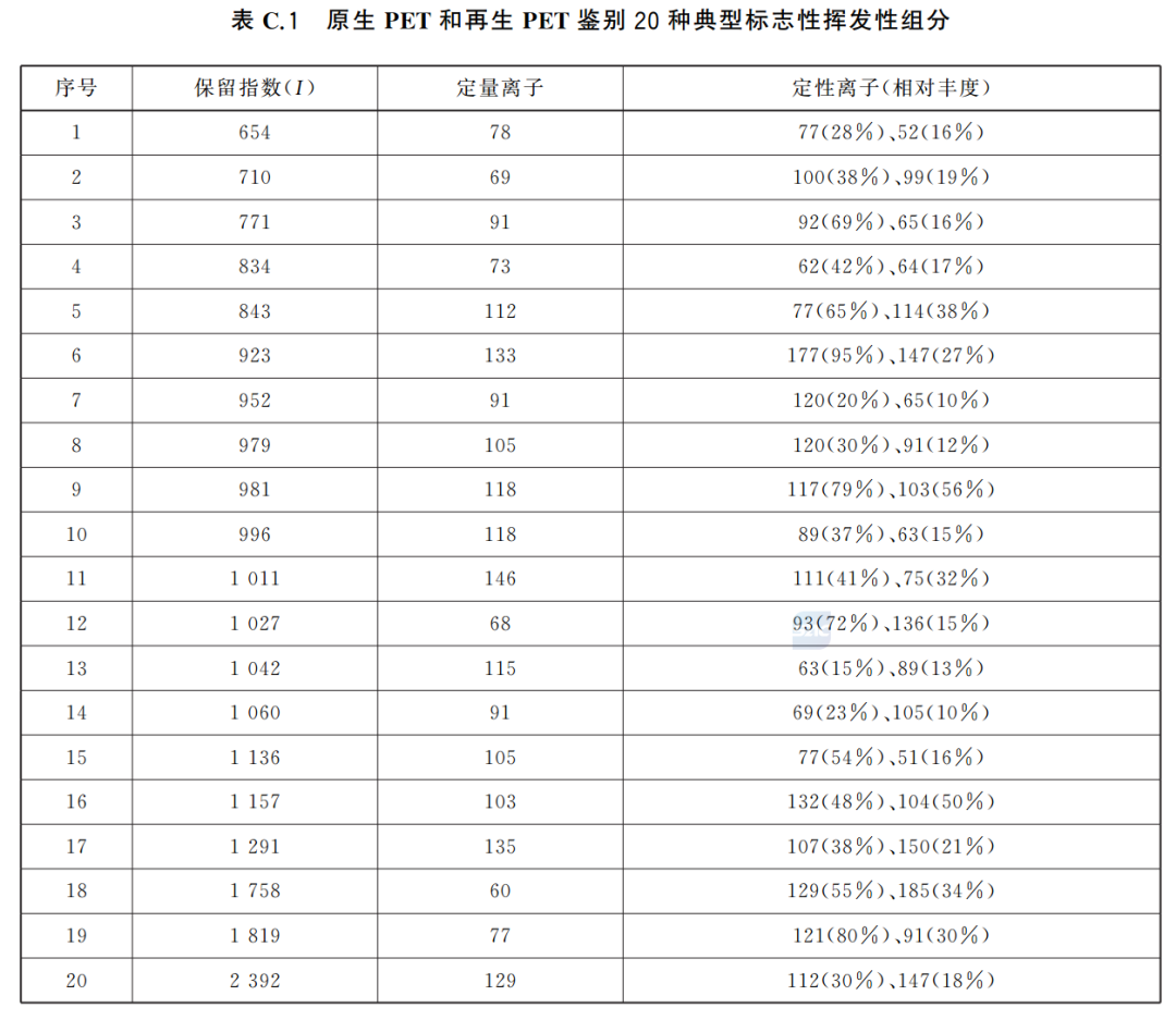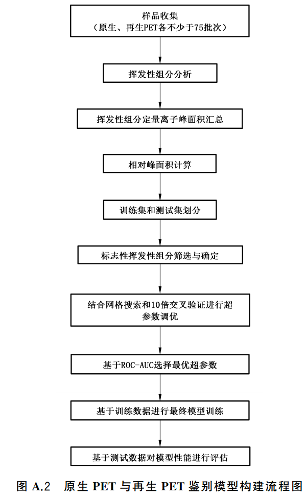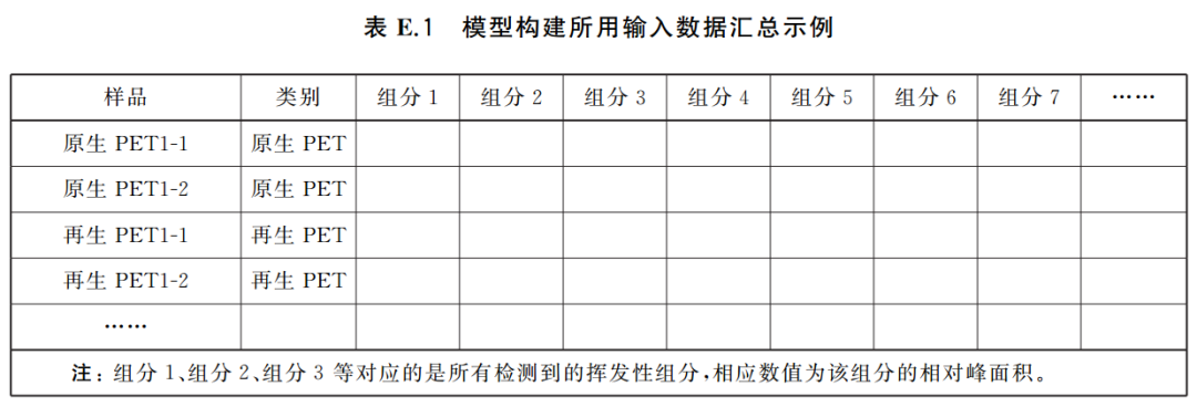 注:若使用第三方提供的鉴别模型,在使用前对其性能进行验证是必要的。验证时,分析不少于10个原生PET和10个再生PET样品是必要的,并对其标志性挥发性组分进行汇总后输入模型进行预测。模型在验证样品中的鉴别准确率不低于95%是能接受的。
