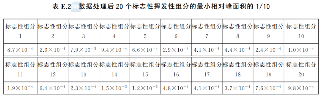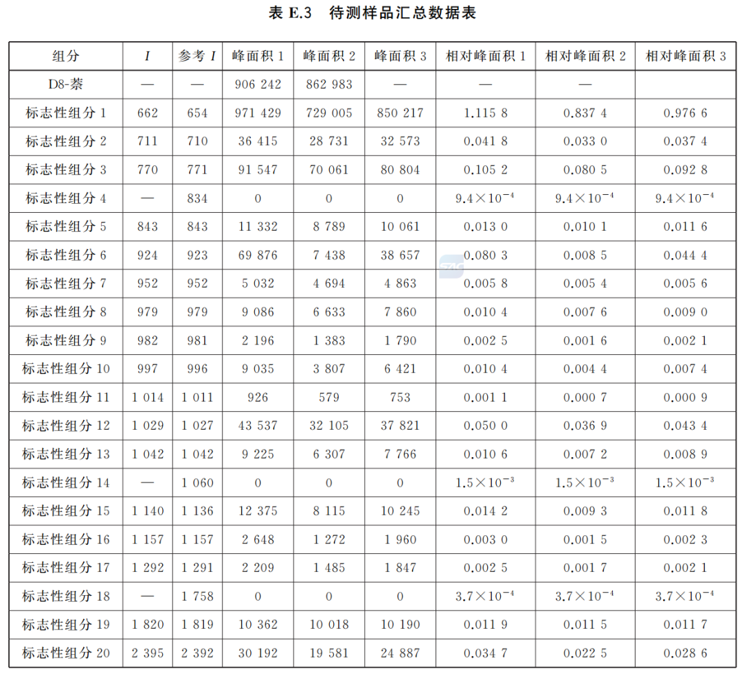 E.4.4 对于未检出的标志性挥发性组分,其相对峰面积记为数据库中相应组分的最小相对峰面积(表E.1)。表E.3展示了待测样品数据的处理过程,包括D8-萘的原始峰面积、每个标志性挥发性组分的保留指数、参考保留指数、原始峰面积以及基于D8-萘归一化后的相对峰面积。