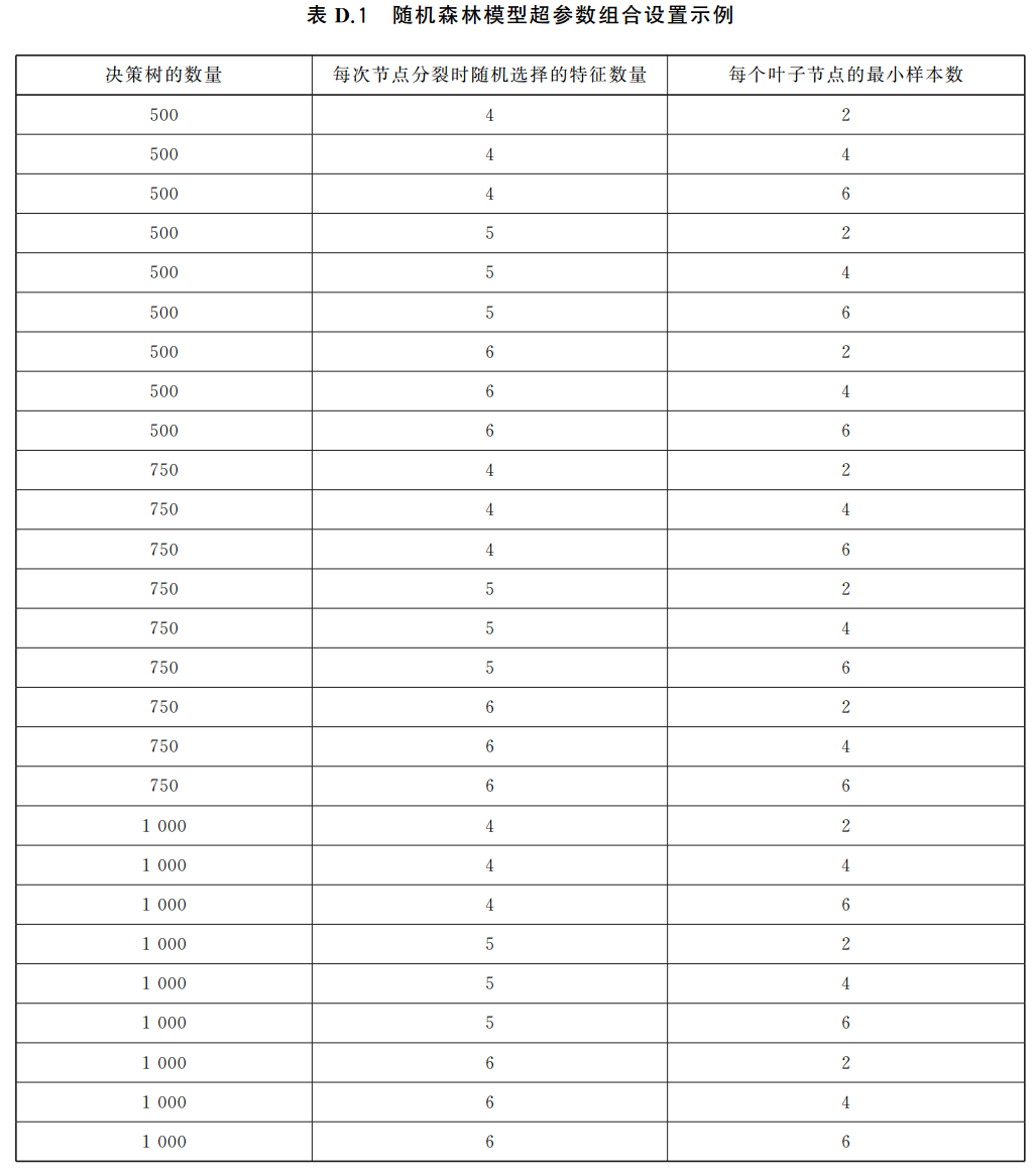 随机森林模型调优过程中使用的超参数组合设置示例见表D.1。