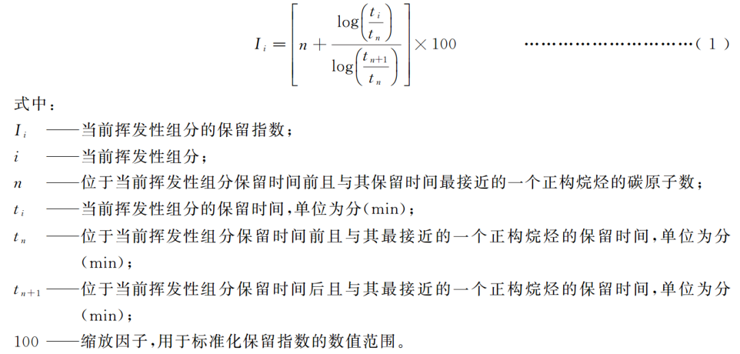 基于标准正构烷烃的保留时间,按照公式(1),计算各挥发性组分的保留指数(I)。