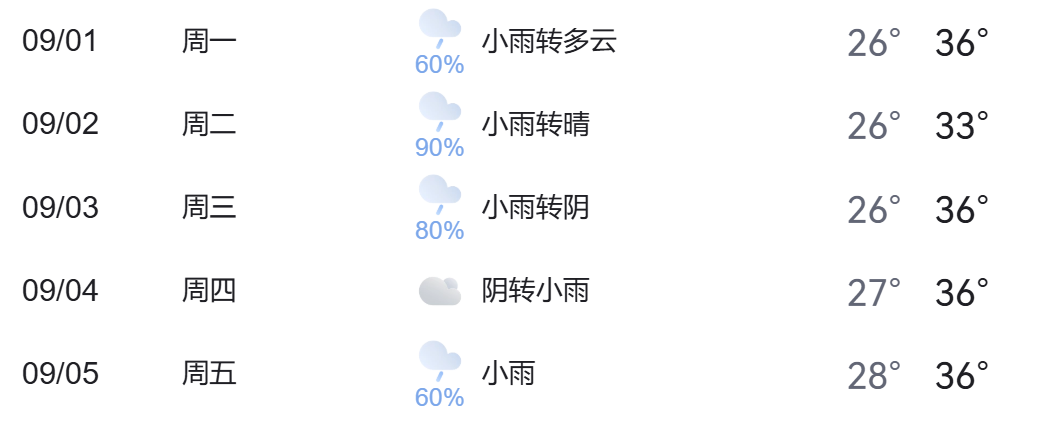 宁波9月1-5日雨水频繁,请各位朋友带好雨具,请您参考如下会展期间宁波天气温度预测图,注意添减衣物;请您留意地面湿滑,注意交通安全!