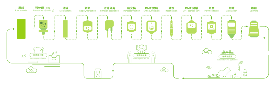 佳人新材料采用独有的化学循环再生系统,以废弃的废旧纺织品为初始原料,通过独特的化学分解技术将废弃聚酯材料还原成化学小分子,经过精馏、过滤、提纯及聚合等高精尖技术手段,重新制成新的具有高品质、多功能、可追溯、永续循环的再生聚酯产品。真正意义上实现从废弃聚酯到再生新材料的永续循环生态圈,可有效降低对石油资源的依赖,减少废弃物的产生。