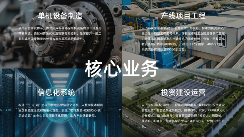 科选环境产线项目工程业务涵盖城市大宗固废十二大板块:建筑装修垃圾资源化处理系统、生活垃圾资源化处理系统、生活垃圾焚渣资源化处理系统、废旧电池回收梯次综合利用、电子及家电废弃物资源化处理系统、废旧金属资源化处理系统、废旧轮胎资源化处理系统、餐厨(厨余)垃圾资源化处理系统、报废汽车资源化处理系统、大件垃圾资源化处理系统、工业废弃物资源化处理系统、陈腐垃圾资源化处理系统、环卫垃圾一体化(可回收物)资源化处理系统等众多整体解决方案。